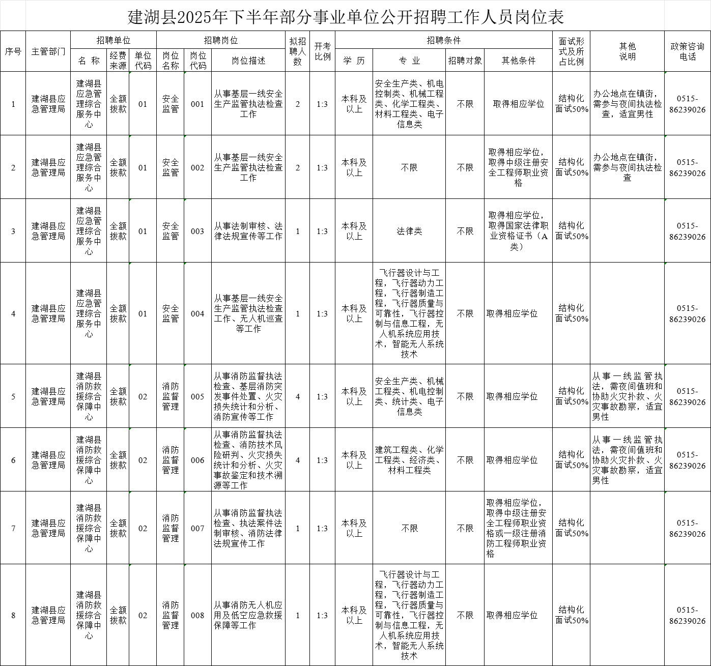 為及時(shí)補(bǔ)充我縣應(yīng)急管理系統(tǒng)事業(yè)單位工作人員,優(yōu)化人員結(jié)構(gòu),根據(jù)《江蘇省事業(yè)單位公開招聘人員辦法》(蘇辦發(fā)〔2020〕9號(hào))精神,建湖縣應(yīng)急管理局部分直屬事業(yè)單位2025年面向社會(huì)公開招聘工作人員16名,F(xiàn)公告如下: