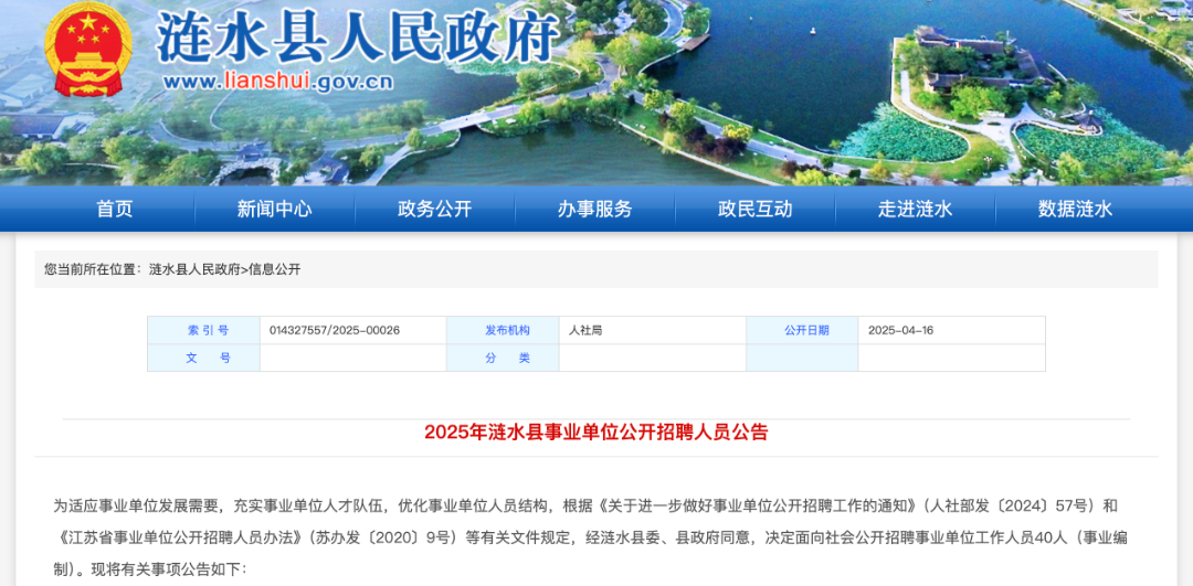 為適應(yīng)事業(yè)單位發(fā)展需要,充實事業(yè)單位人才隊伍,優(yōu)化事業(yè)單位人員結(jié)構(gòu),根據(jù)《關(guān)于進一步做好事業(yè)單位公開招聘工作的通知》(人社部發(fā)〔2024〕57號)和《江蘇省事業(yè)單位公開招聘人員辦法》(蘇辦發(fā)〔2020〕9號)等有關(guān)文件規(guī)定,經(jīng)漣水縣委、縣政府同意,決定面向社會公開招聘事業(yè)單位工作人員40人(事業(yè)編制),F(xiàn)將有關(guān)事項公告如下: