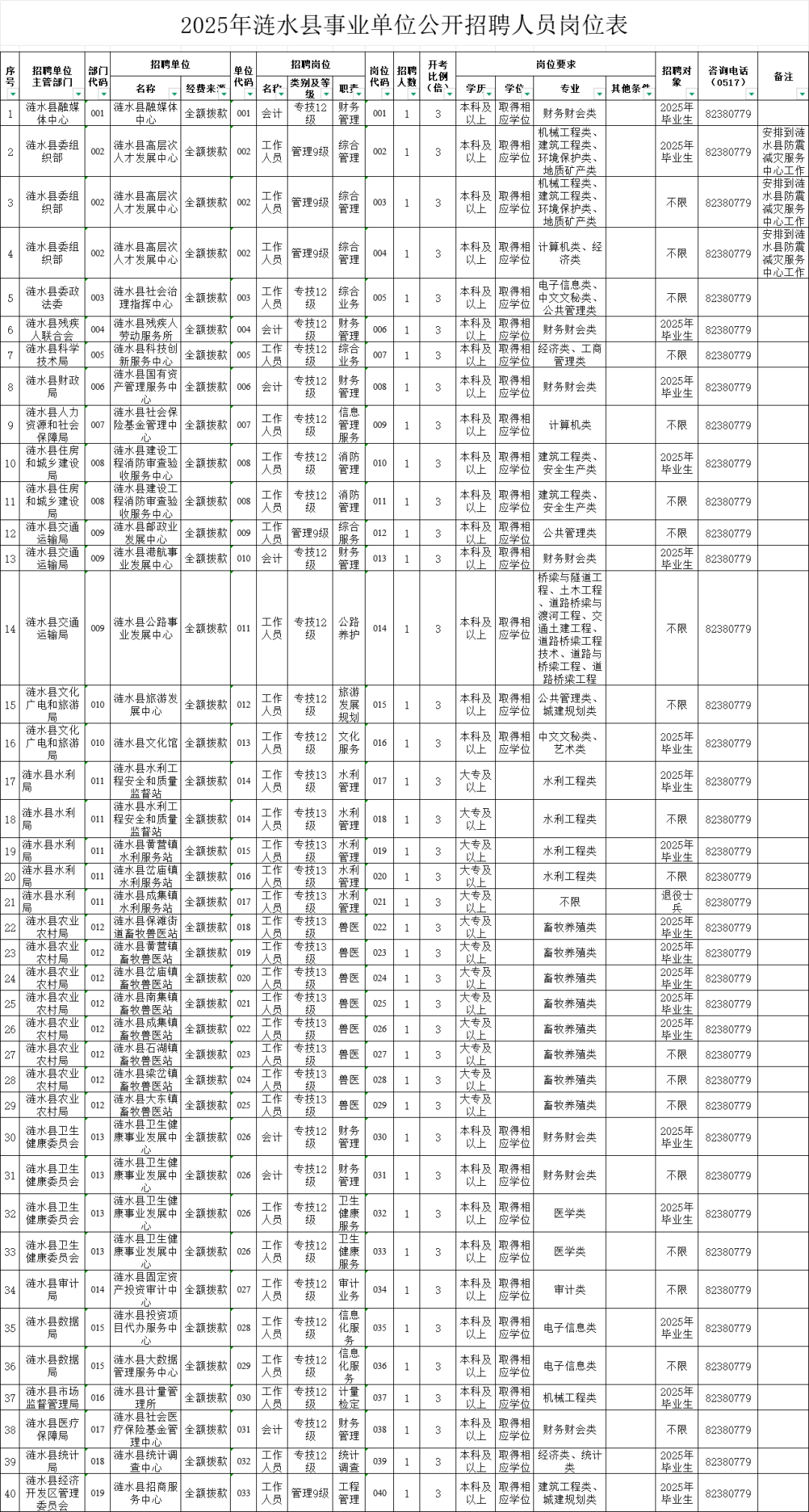 招聘單位、崗位、人數(shù)和相關(guān)要求詳見《2025年漣水縣事業(yè)單位公開招聘人員崗位表》(以下簡稱《崗位表》)。