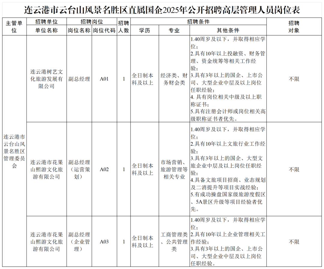 連云港市云臺(tái)山風(fēng)景名勝區(qū)管理委員會(huì)直屬國企2025年公開招聘高層管理人員公告