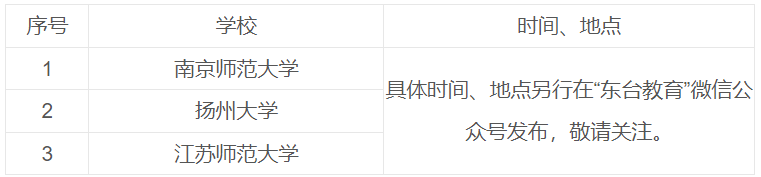 本次校園招聘擬于省內(nèi)部分高校設(shè)置報(bào)名點(diǎn),由東臺(tái)市教育局組織相關(guān)學(xué)校進(jìn)行宣講,宣講會(huì)后即組織現(xiàn)場(chǎng)報(bào)名。各院校宣講、報(bào)名具體時(shí)間、地點(diǎn)安排如下: