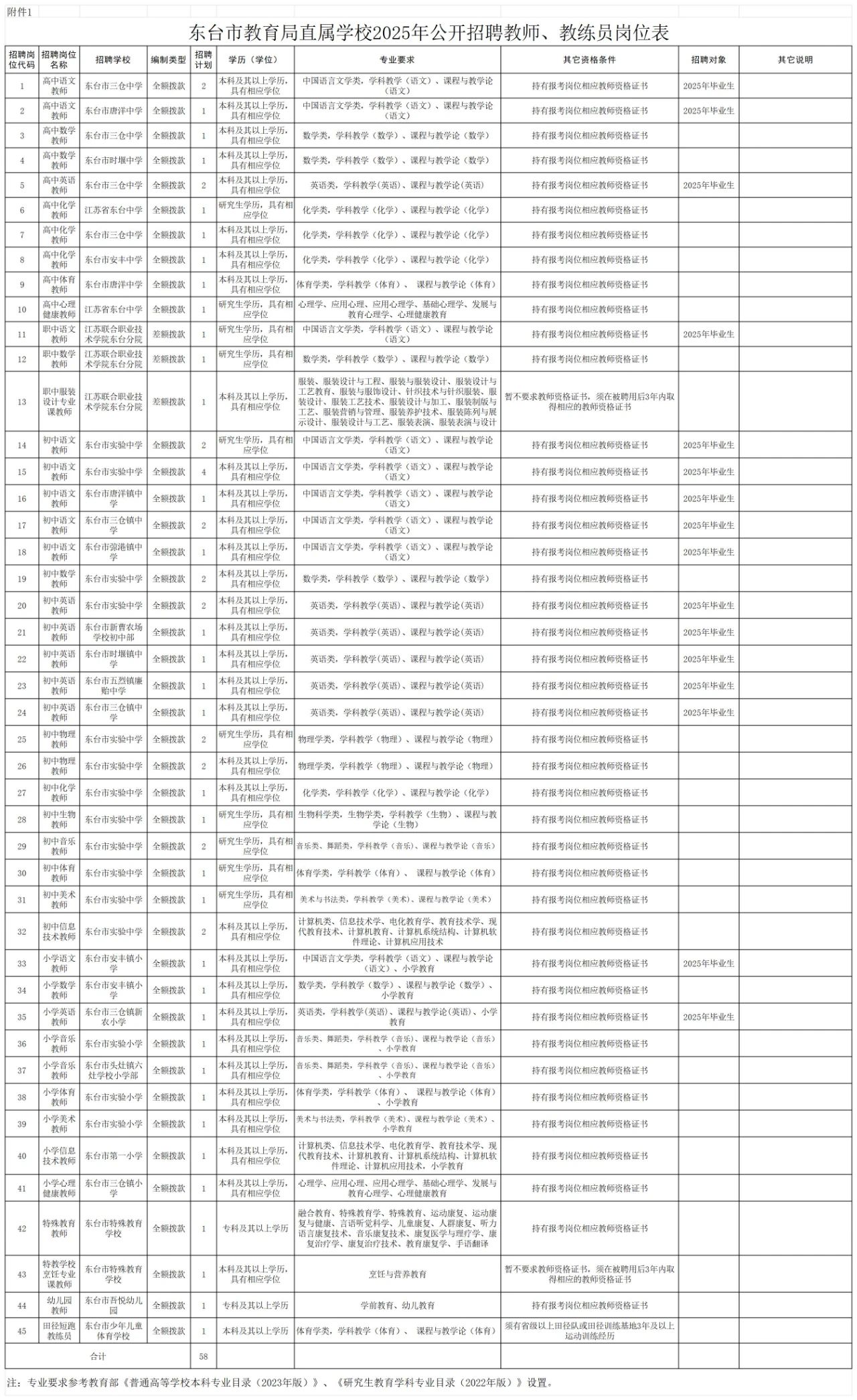 為適應我市教育事業(yè)發(fā)展需要,進一步優(yōu)化師資隊伍結(jié)構(gòu),東臺市教育局直屬學校2025年計劃面向社會公開招聘教師57名、田徑短跑教練員1名,F(xiàn)公告如下: