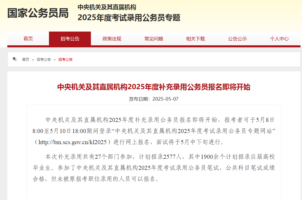 - 2577人!2025國考補(bǔ)錄公告正式發(fā)布!