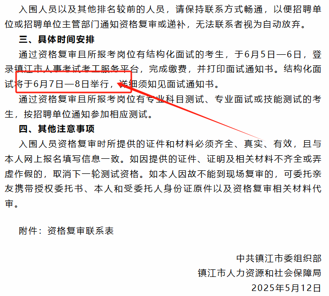 根據(jù)鎮(zhèn)江發(fā)布的《關(guān)于鎮(zhèn)江市事業(yè)單位2025年集中公開招聘資格復(fù)審的公告》中提到:結(jié)構(gòu)化面試將于6月7日—8日舉行,詳細須知見面試通知書。