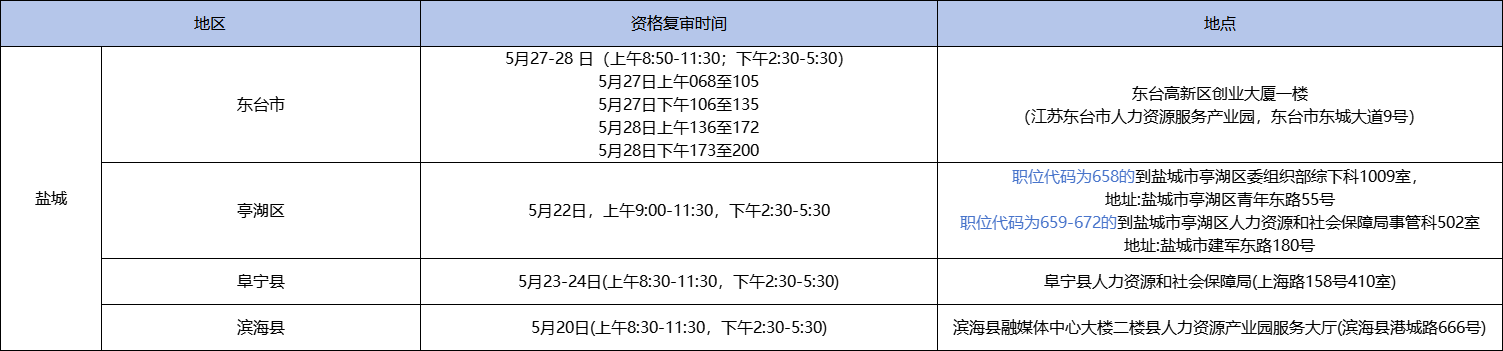 2025年江蘇事業(yè)單位統(tǒng)考鹽城各縣市區(qū)資格復審公告陸續(xù)公布中,截至目前,東臺市、亭湖區(qū)、阜寧縣、濱?h已出公告。