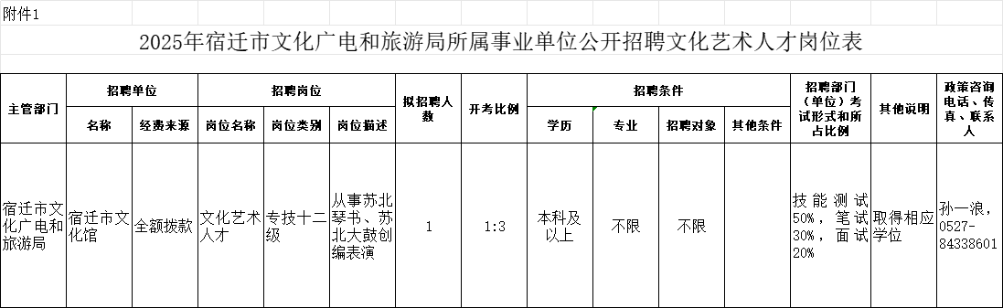 - 1人!事業(yè)編!宿遷市文化廣電和旅游局2025年局屬事業(yè)單位公開招聘公告