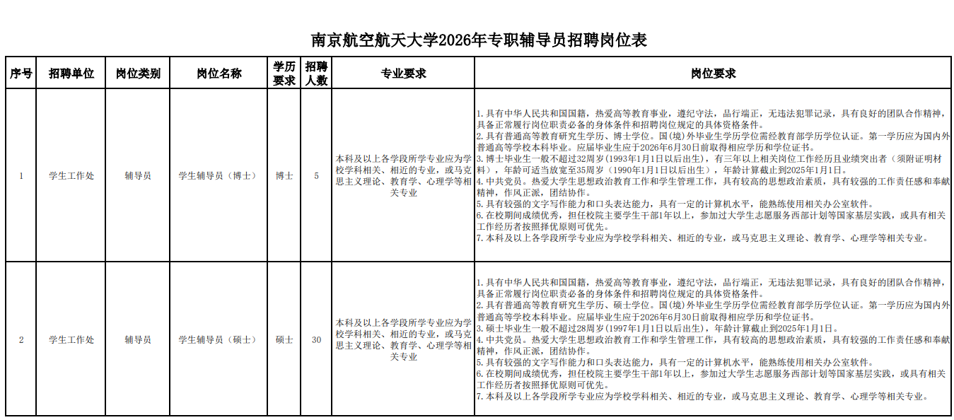 (一)招聘崗位招聘崗位及具體要求詳見(jiàn)《南京航空航天大學(xué)2026年專職輔導(dǎo)員招聘崗位表》