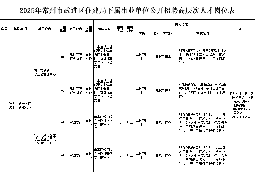 - 4人!事業(yè)編!2025年常州市武進區(qū)住房和城鄉(xiāng)建設局下屬事業(yè)單位公開招聘高層次人才公告