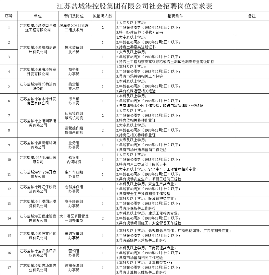 - 21人!市屬國企!江蘇鹽城港控股集團有限公司招聘公告