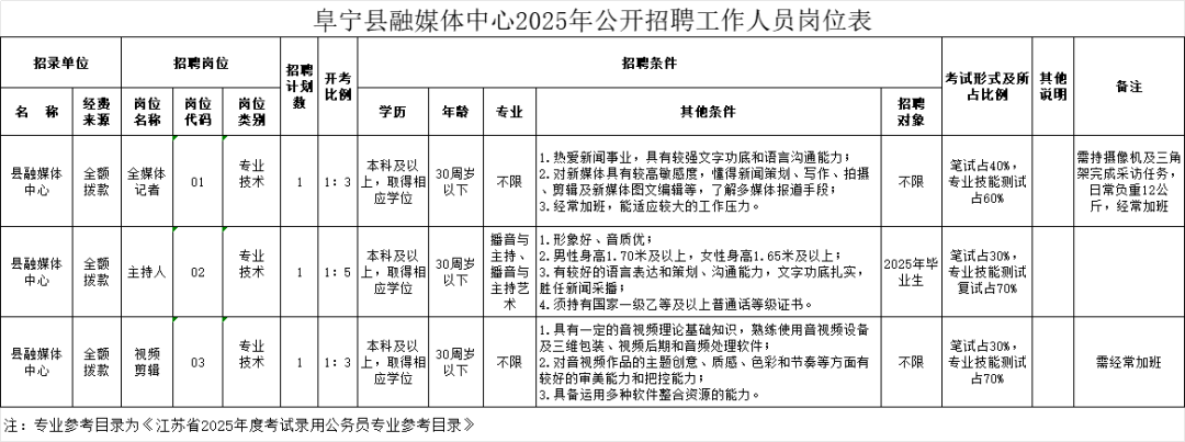 - 3人!事業(yè)編!阜寧縣融媒體中心2025年公開(kāi)招聘工作人員公告
