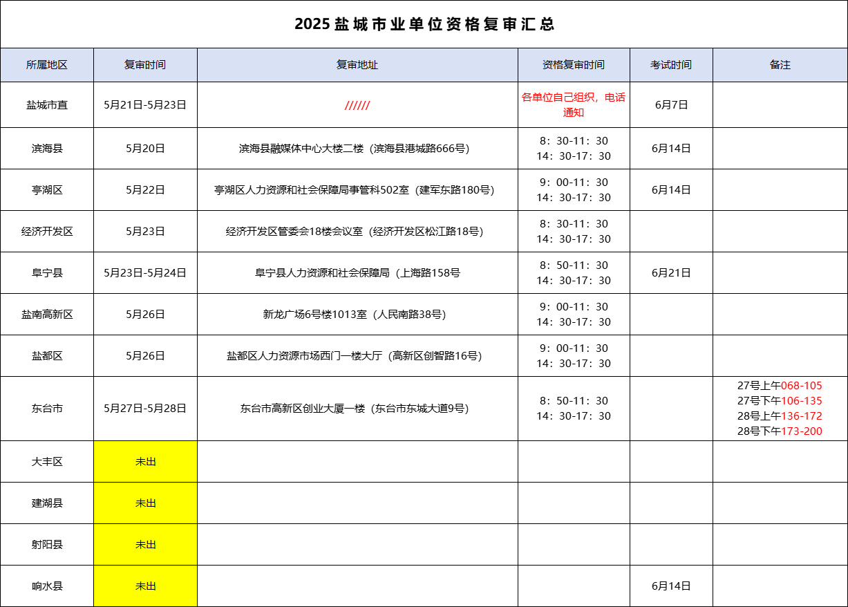 2025年江蘇事業(yè)單位統(tǒng)考鹽城各縣市區(qū)資格復審公告陸續(xù)公布中,截至目前已出公告的地區(qū)如下。