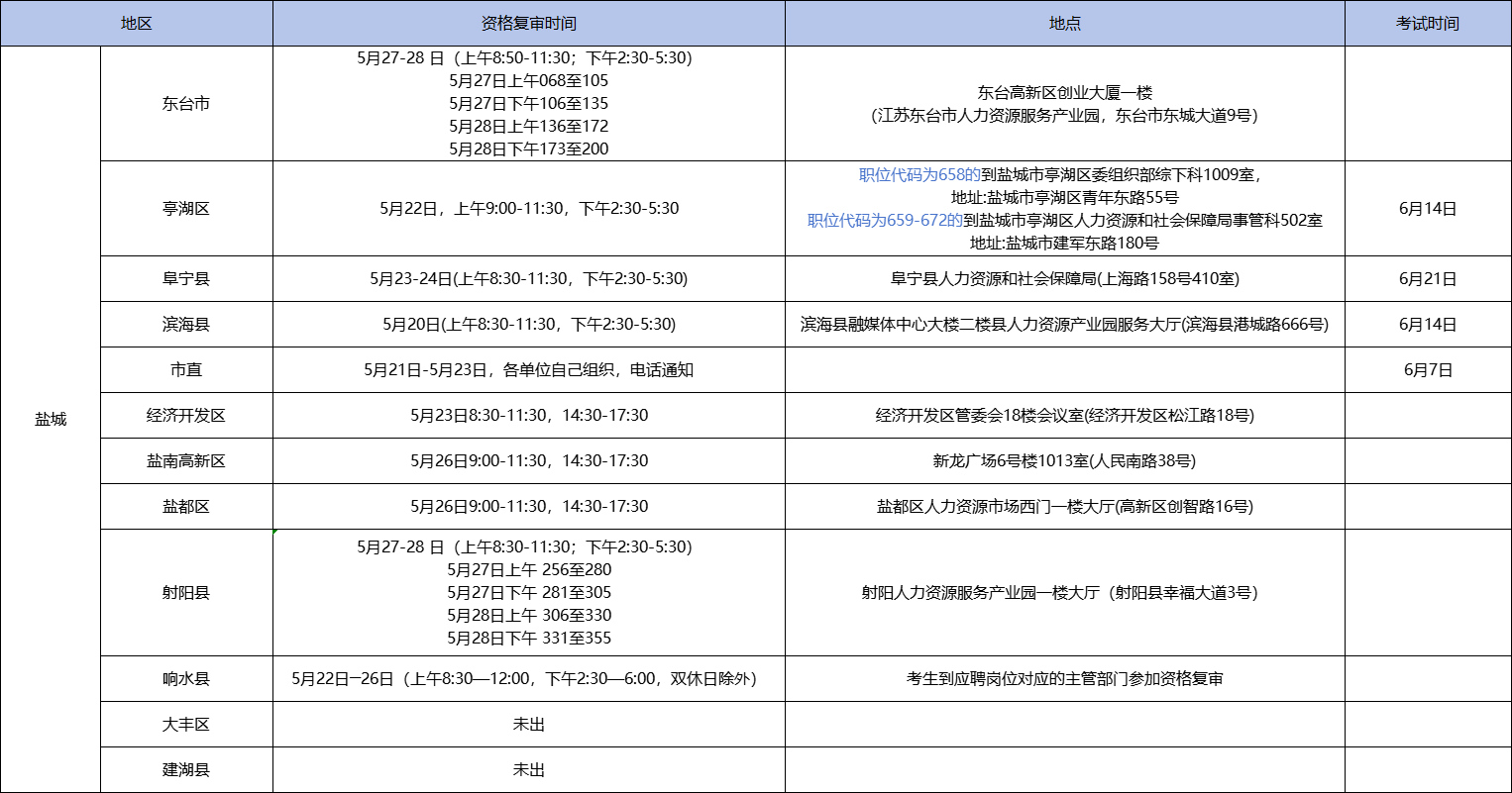 2025年江蘇事業(yè)單位統(tǒng)考鹽城各縣市區(qū)資格復(fù)審公告陸續(xù)公布中,截至目前,僅剩大豐區(qū)、建湖縣公告尚未發(fā)布。