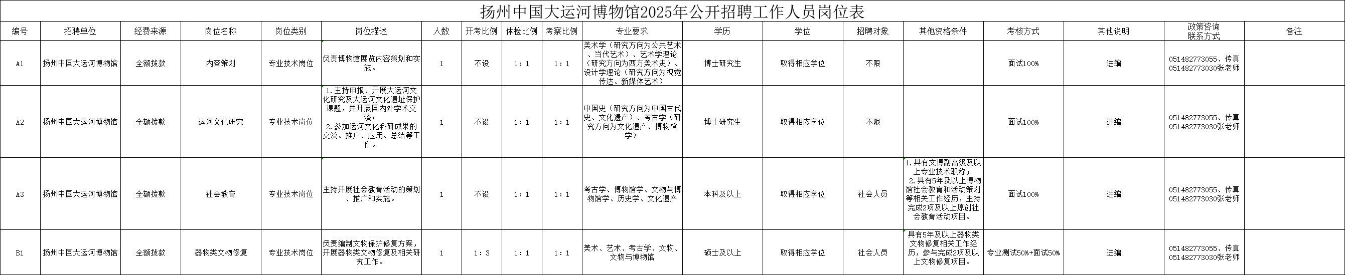 6.具備報(bào)考崗位要求的專業(yè)、技能等資格條件(詳見《揚(yáng)州中國(guó)大運(yùn)河博物館2025年公開招聘工作人員崗位表》)。