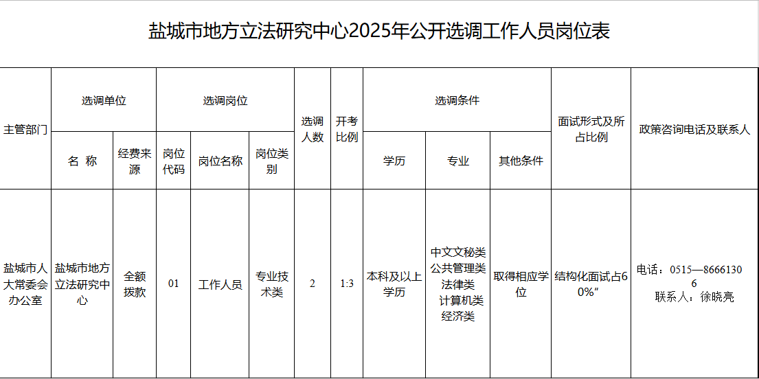 - 2人!事業(yè)編選調(diào)!鹽城市地方立法研究中心關(guān)于公開選調(diào)工作人員的公告