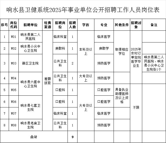 - 9人!衛(wèi)生編!鹽城市響水縣衛(wèi)健系統(tǒng)事業(yè)單位2025年公開招聘工作人員公告