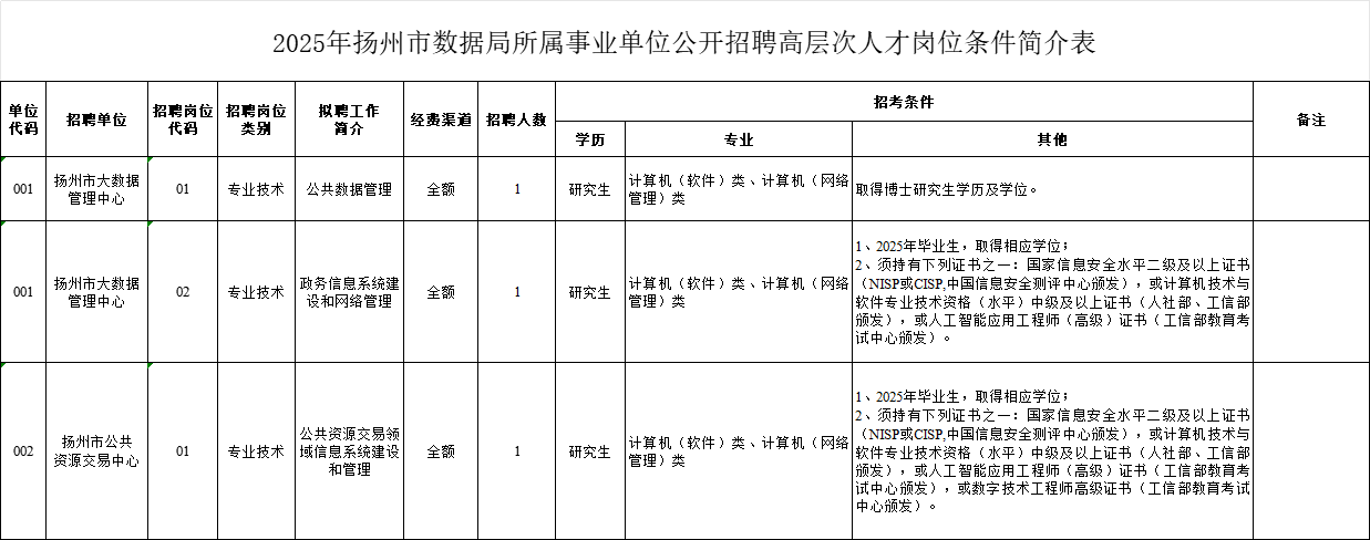 - 3人!事業(yè)編!不限戶籍!2025揚州市數據局所屬事業(yè)單位招聘高層次人才公告