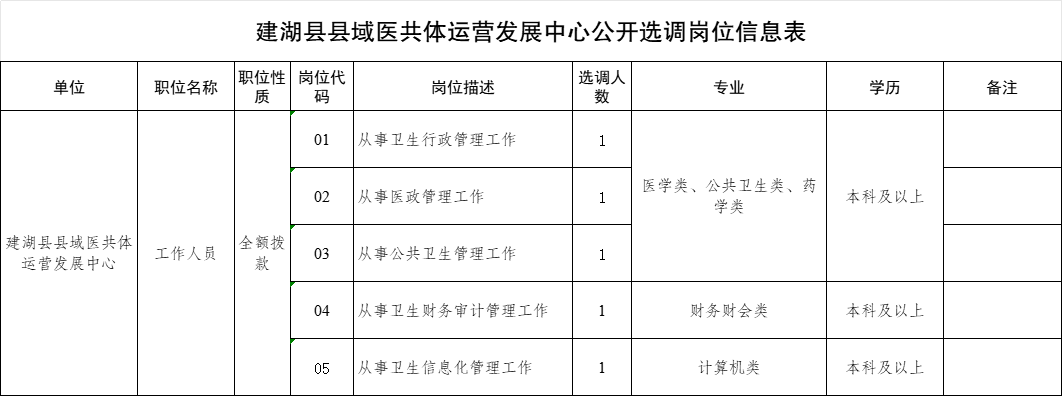 為進(jìn)一步推動醫(yī)共體實質(zhì)性運轉(zhuǎn)工作,建湖縣衛(wèi)生健康委員會下屬事業(yè)單位建湖縣縣域醫(yī)共體運營發(fā)展中心擬面向全縣衛(wèi)生健康系統(tǒng)內(nèi)公開選調(diào)工作人員5名。現(xiàn)將有關(guān)事項公告如下: