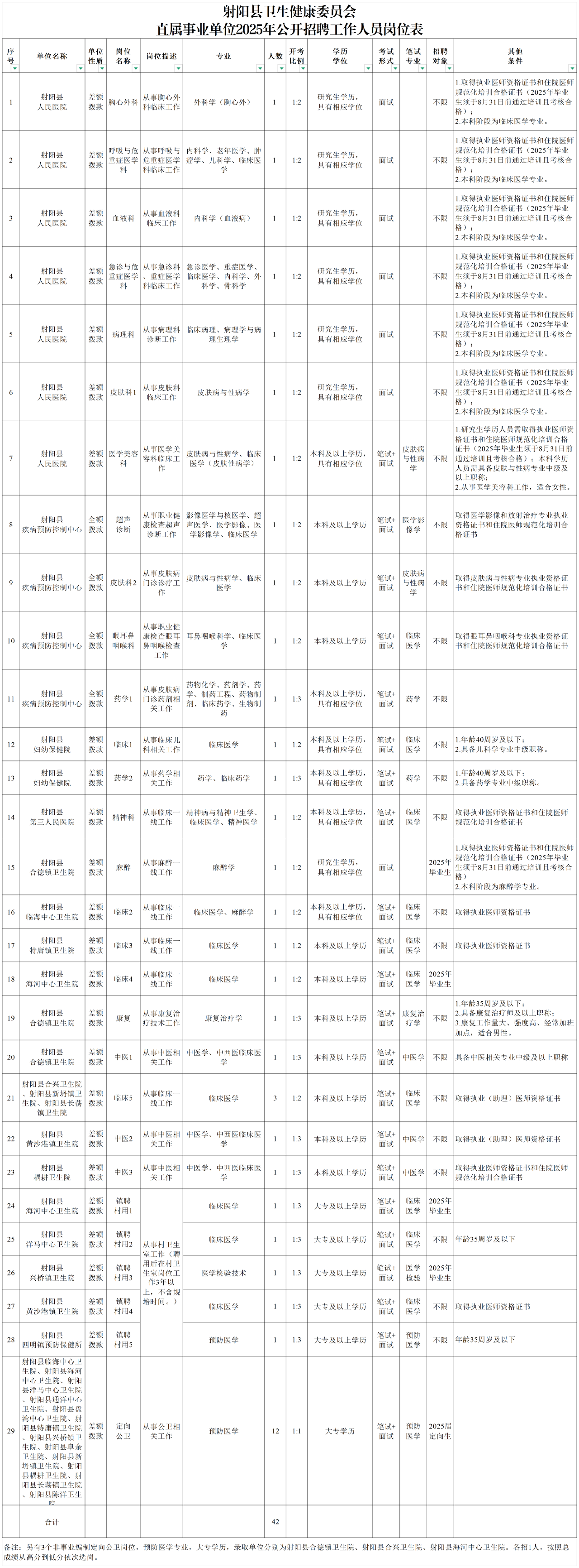 - 42人!醫(yī)療編!射陽(yáng)縣衛(wèi)生健康委員會(huì)直屬事業(yè)單位2025年公開(kāi)招聘工作人員公告