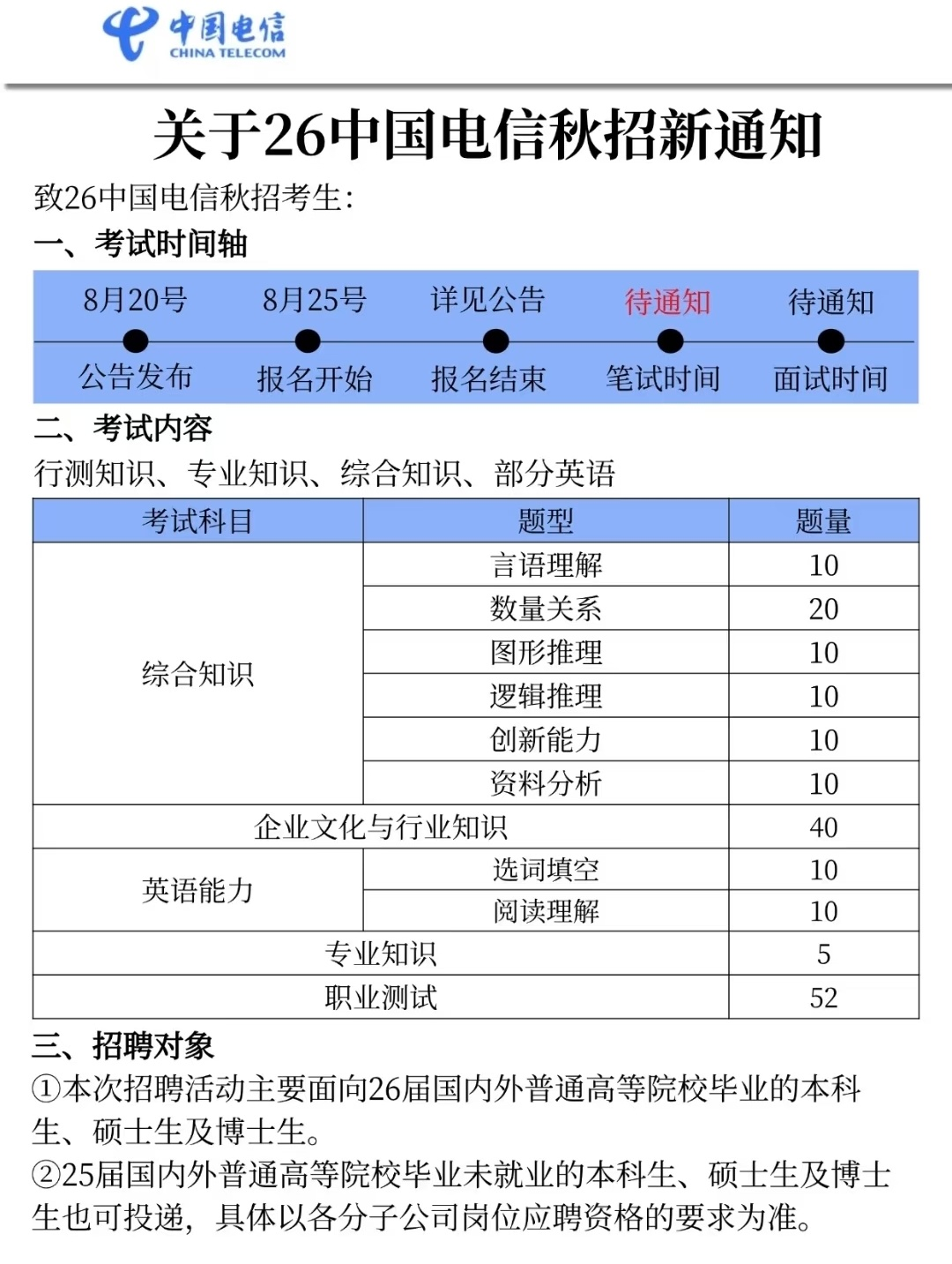 - 2026中國(guó)電信秋招考什么?江蘇有崗!