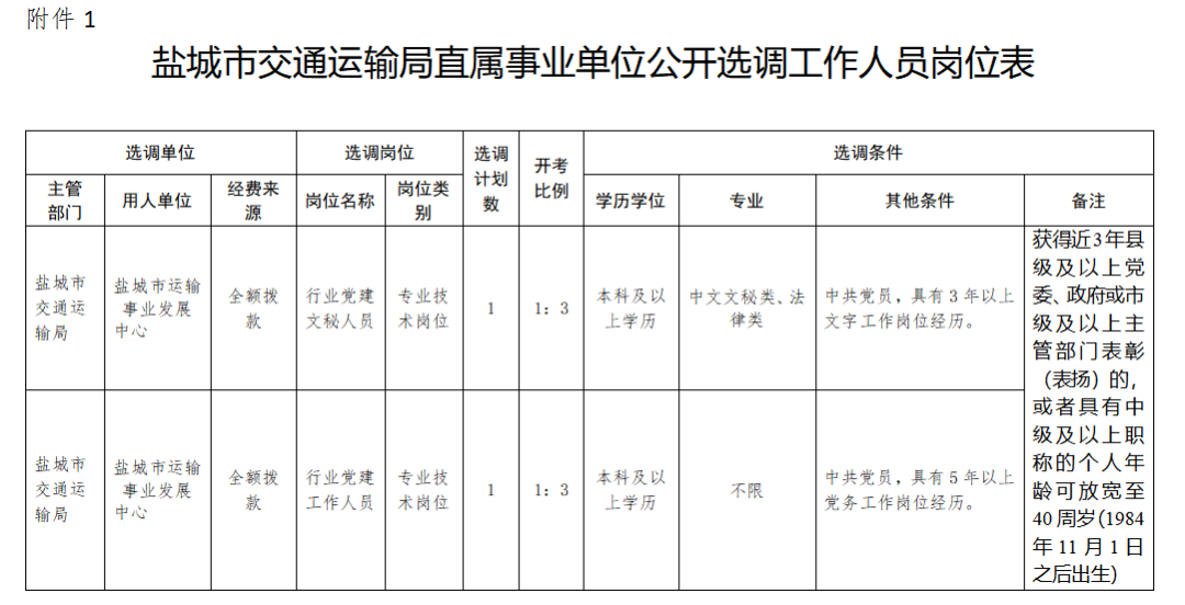 - 2人!事業(yè)編選調(diào)!2025年鹽城市運(yùn)輸事業(yè)發(fā)展中心公開選調(diào)工作人員公告!